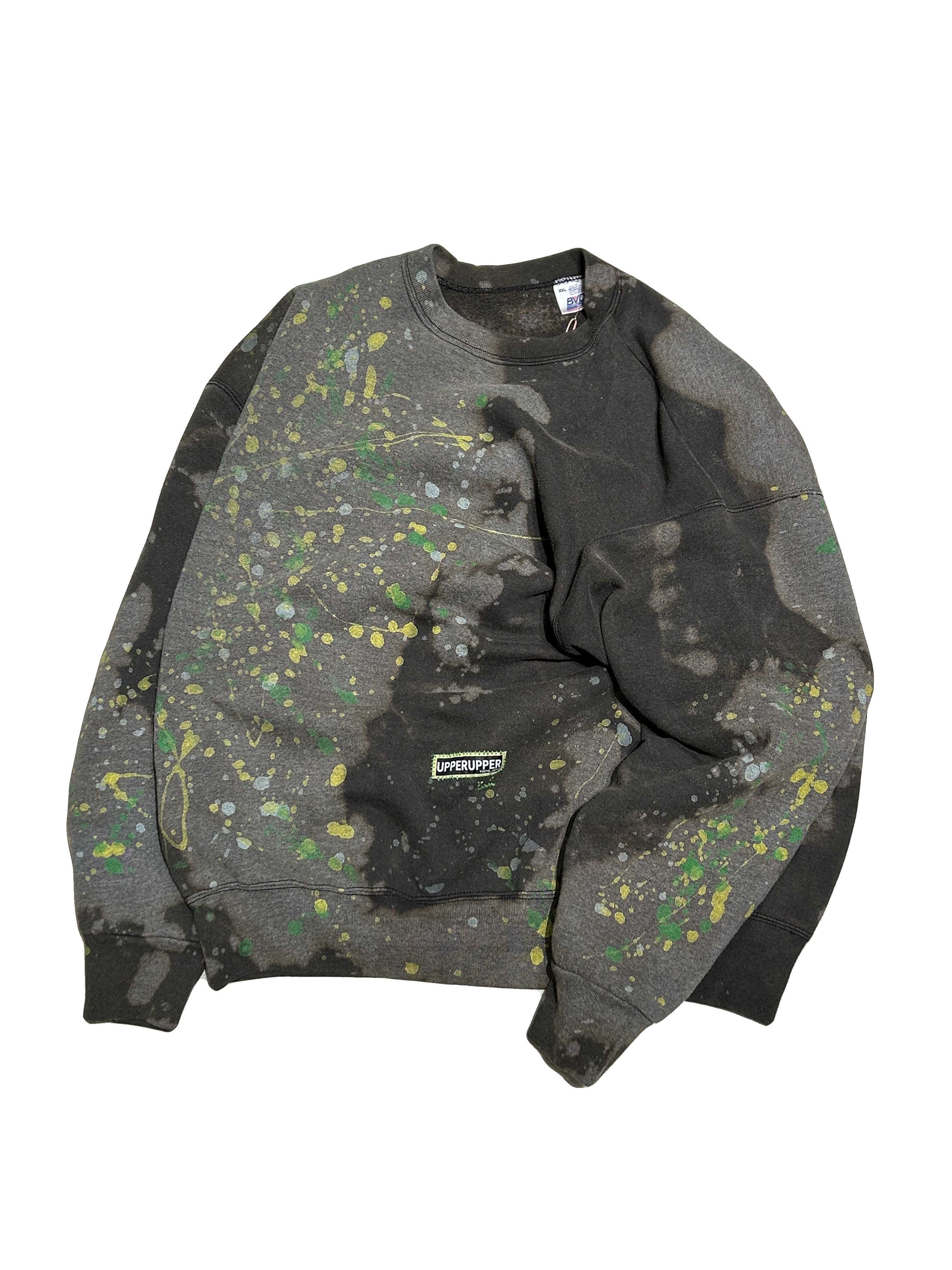 こちらの UPRUPR upcycle sweatshirt XXLは、2000年頃のBVDスウェットを使用したアップサイクル品です。大胆な変色加工を施して、カラフルなペイントを飛び散らすことで、ラフなアート感を演出しました。当時感溢れるゆるいシルエットのベーシックなスウェットが、個性を得た1着に仕上がっています!
