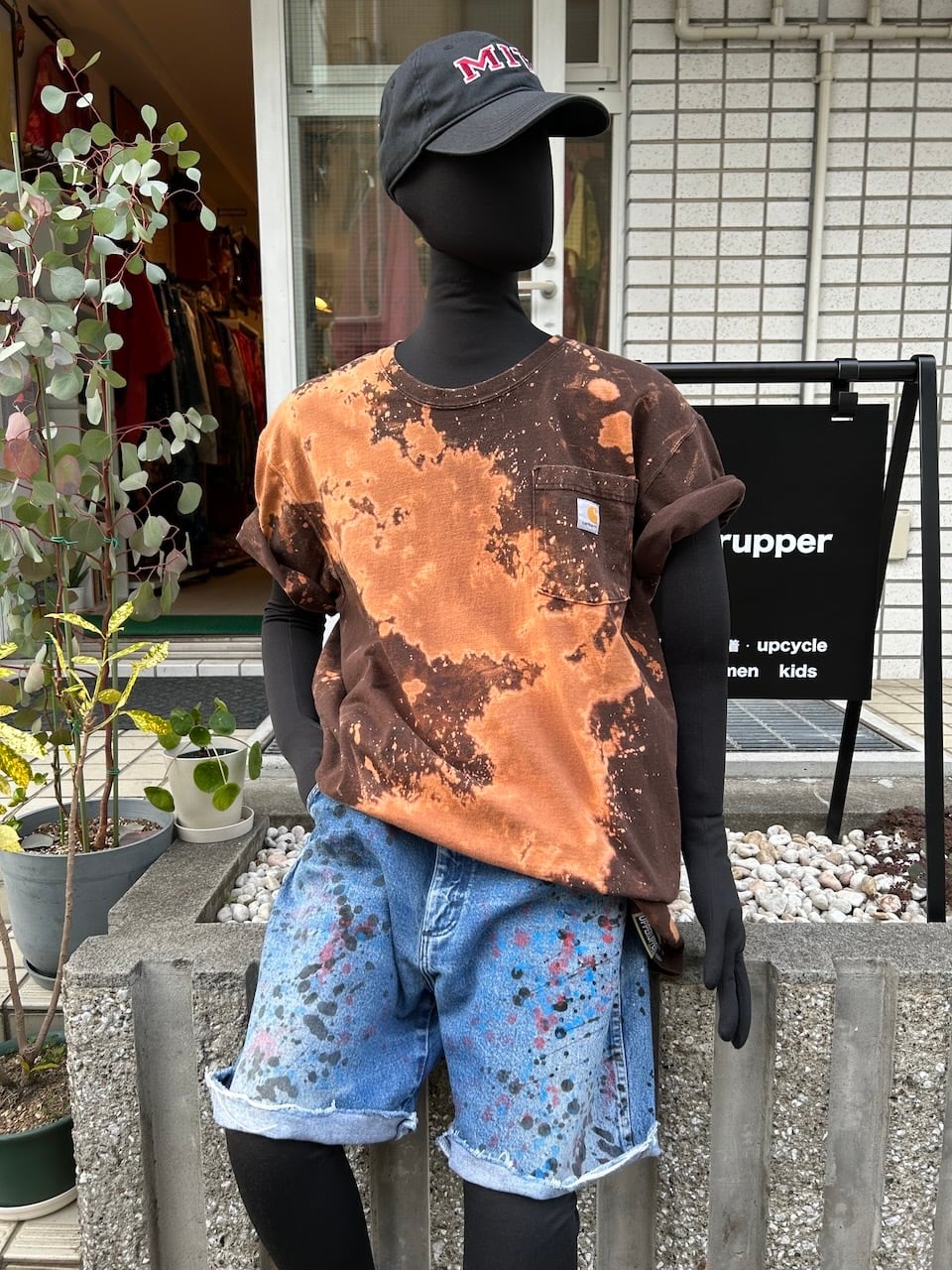 こちらの UPRUPR upcycle Tee Lは、カーハートのポケットTシャツを使用したアップサイクル品です。大胆な変色加工を施し、ラフなアート感を演出しました。オーバーサイズ気味の上質な定番Tシャツが、個性的な魅力を持つ一着に仕上がっています!