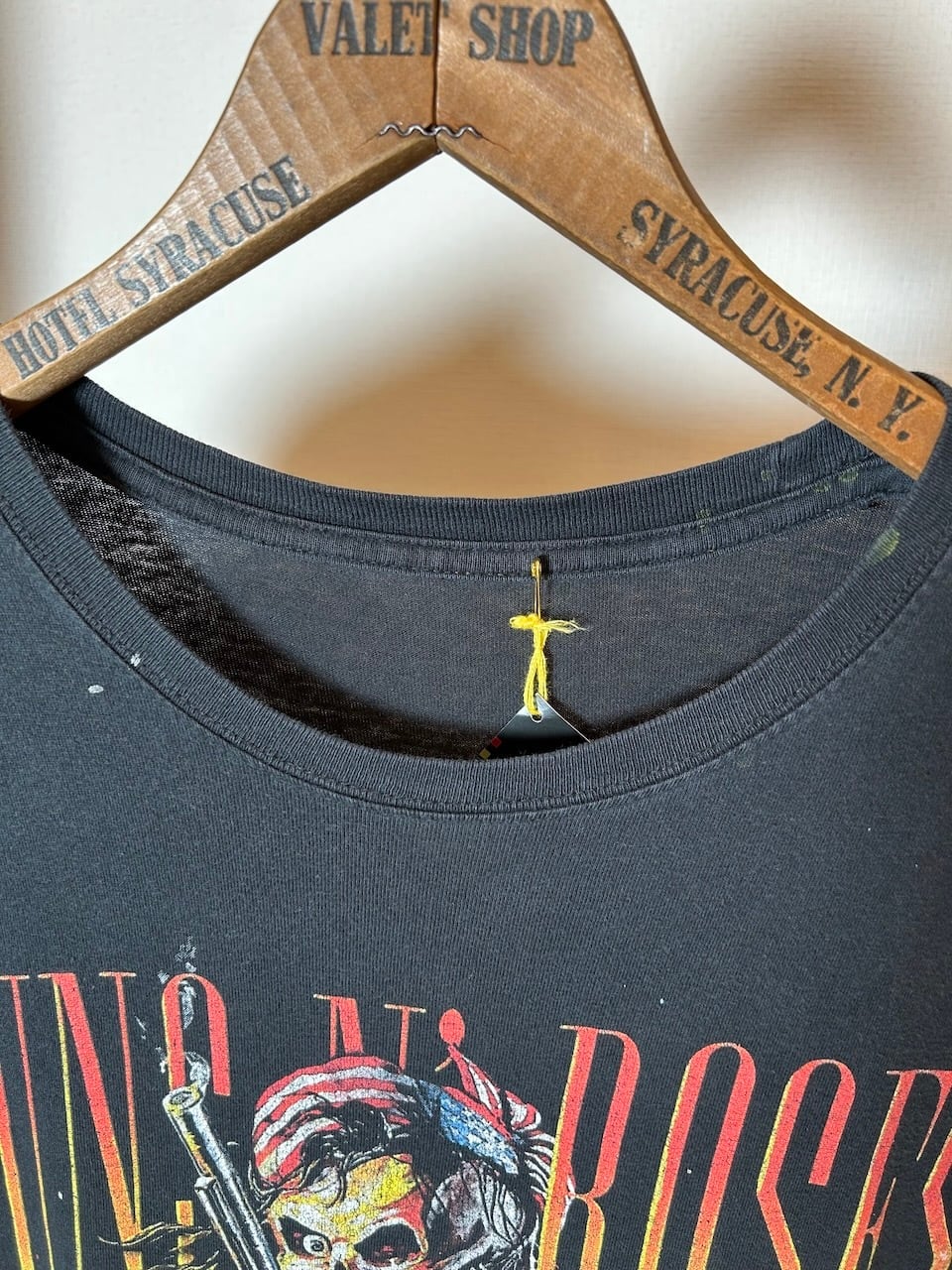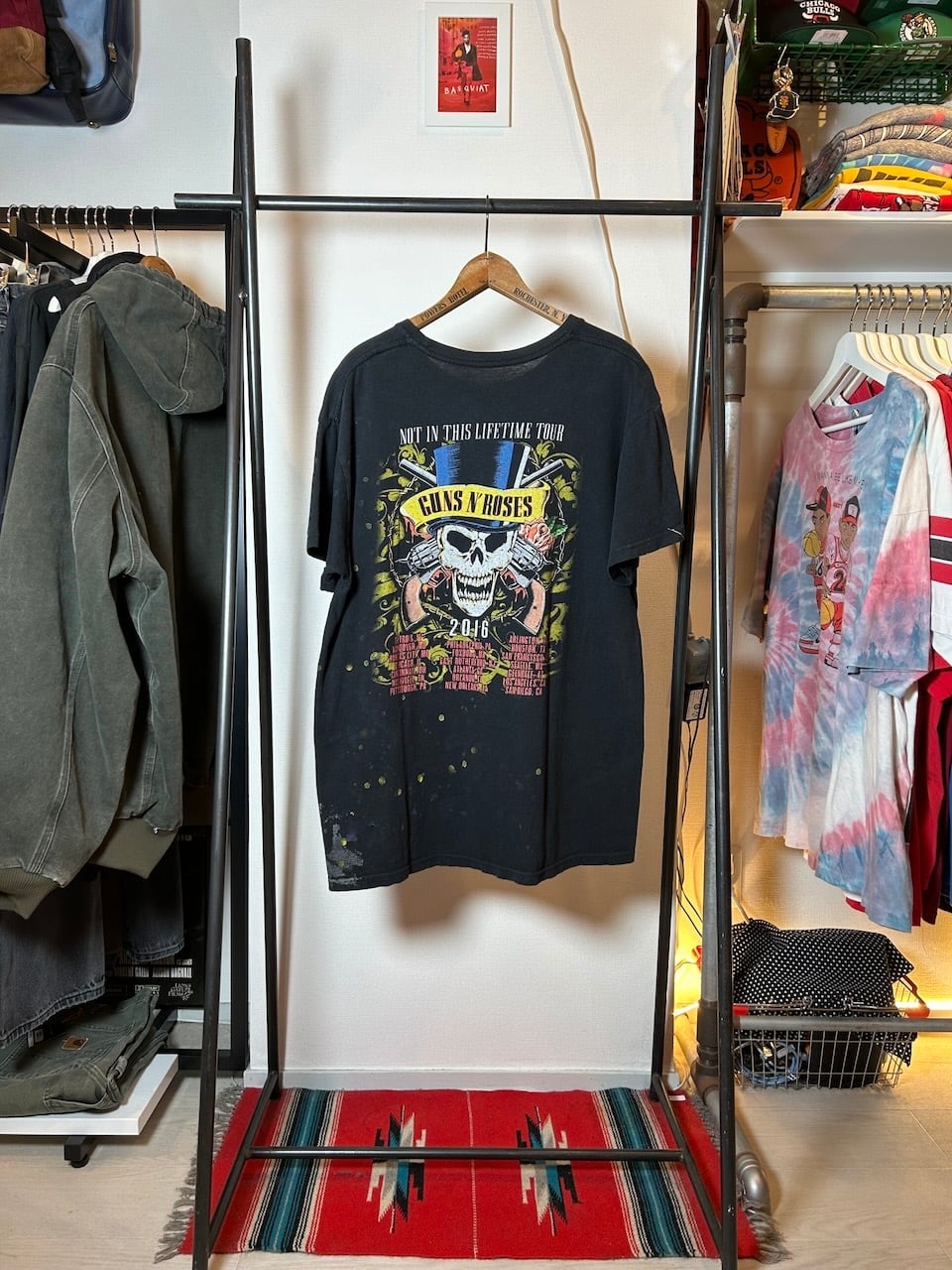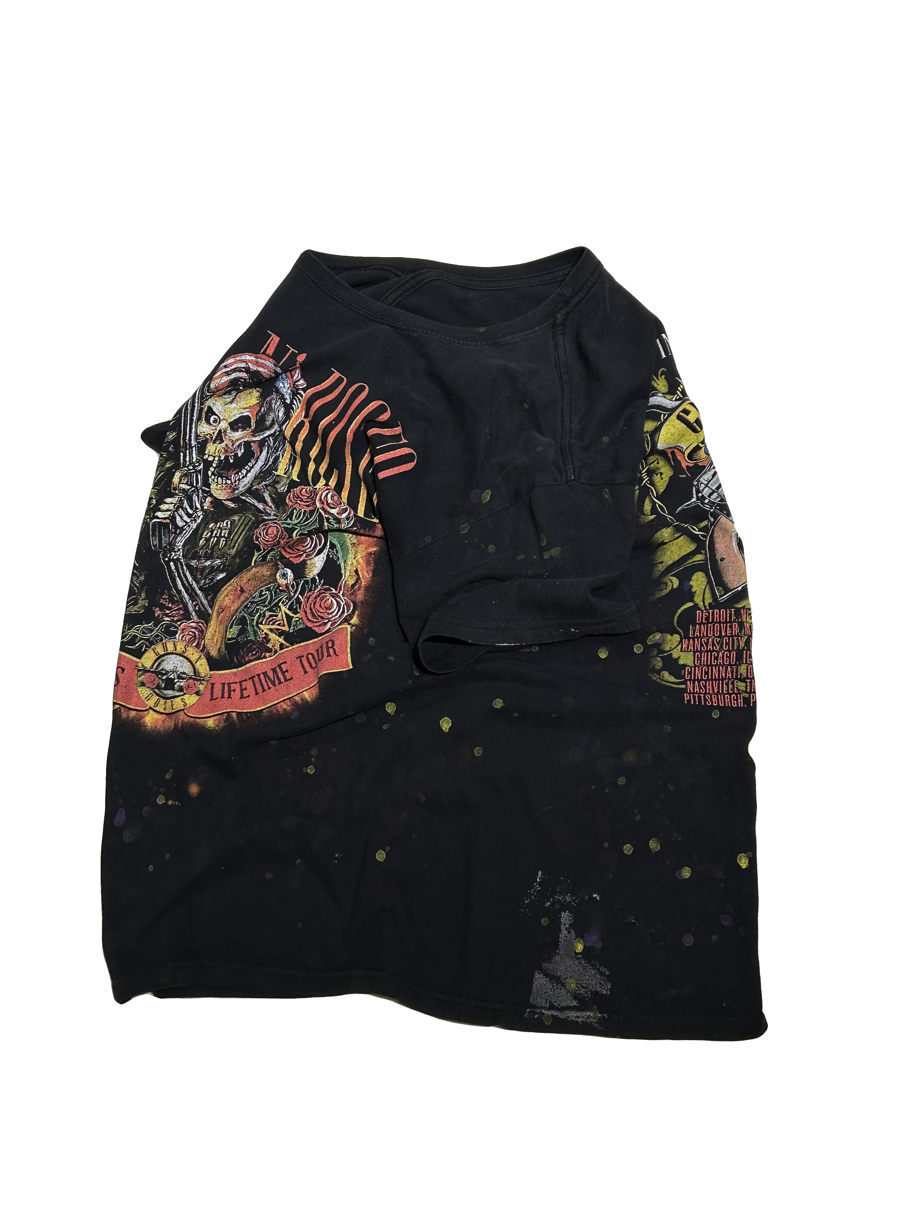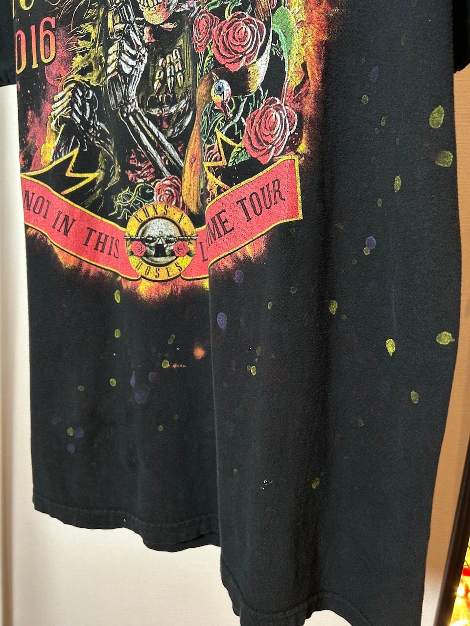 こちらの 2016 Guns N Roses Tee Lは、2016年のガンズ北米ライブツアーのTシャツです。ロックの象徴ともいえるガンズらしいアートイラストが両面に描かれ、程よいダメージと飛び散るペイントが、ハードロックな雰囲気を感じさせてくれます。