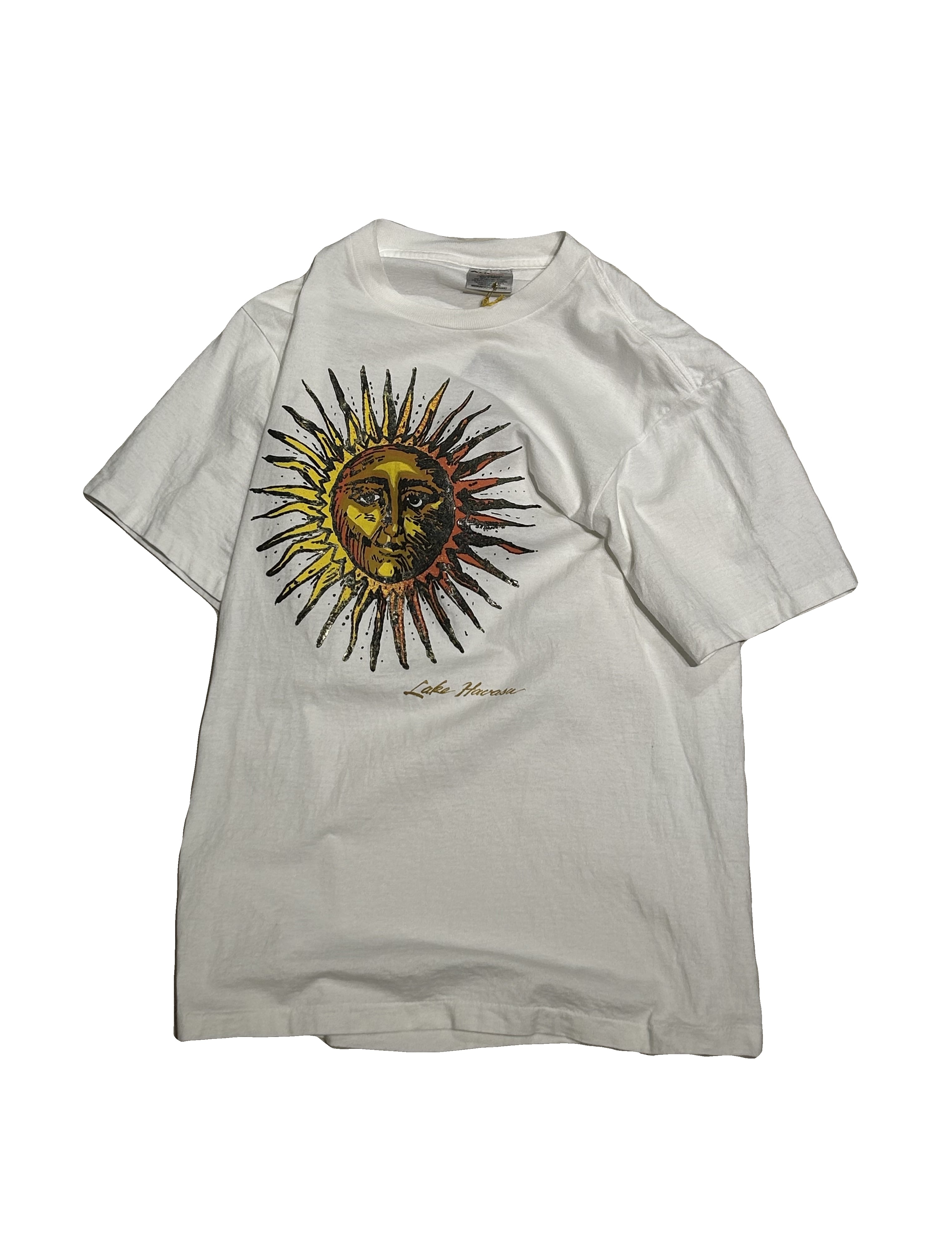 こちらの90's Lake Havasu Tee Mは、1990年代にアメリカで製造されたレイクハバスの太陽プリントTシャツです。アリゾナのギラギラ熱い太陽を描いたイラストがアート感たっぷりで、シンプルな白ボディにその表情が映える一枚です。