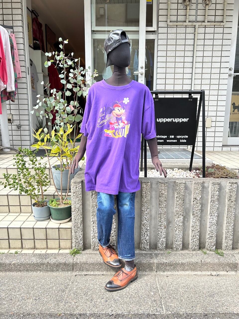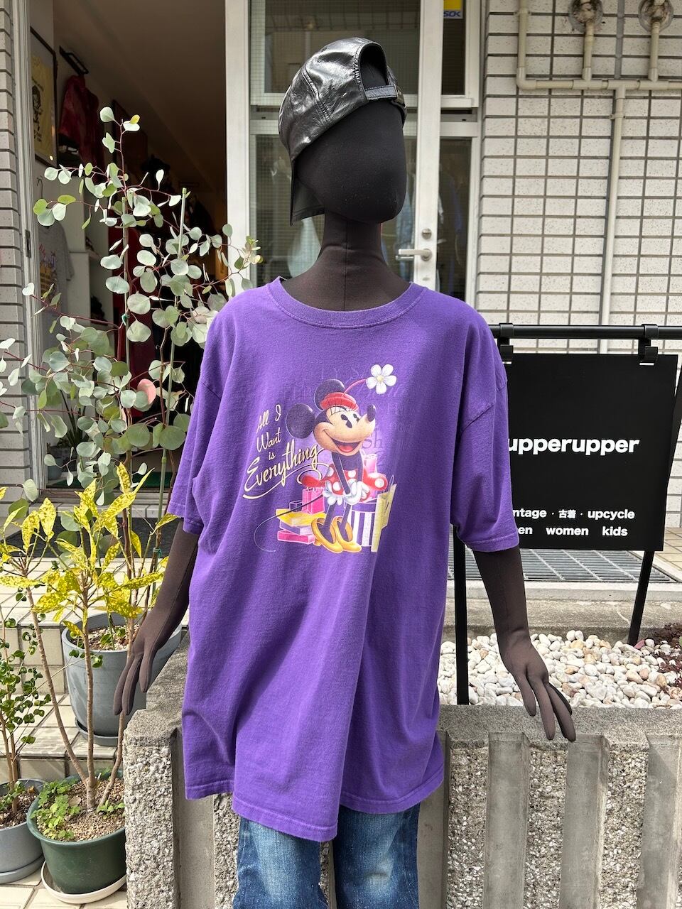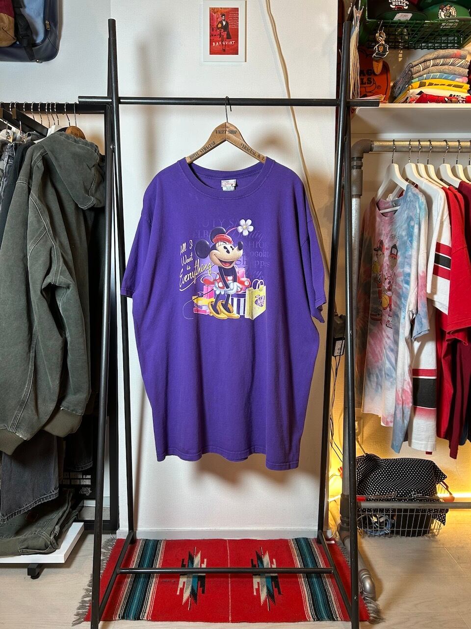 こちらの00's Minnie Tee 2XLは、2000年代に製造されたミニーTシャツです。大きめサイズの紫ボディに、ショッピングを存分に楽しむミニーのプリントが印象的な一枚です。
