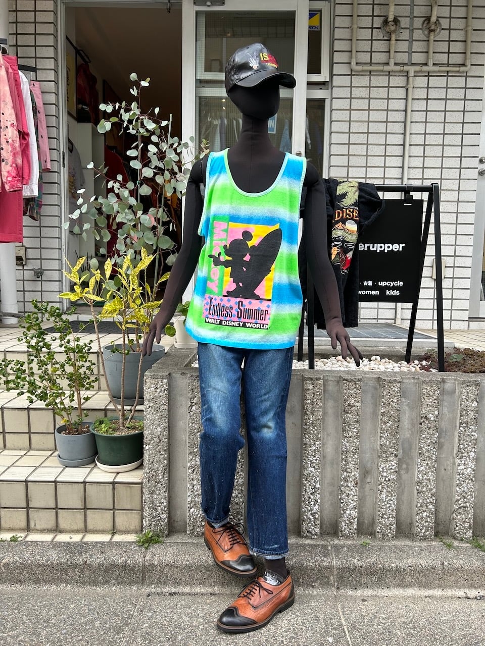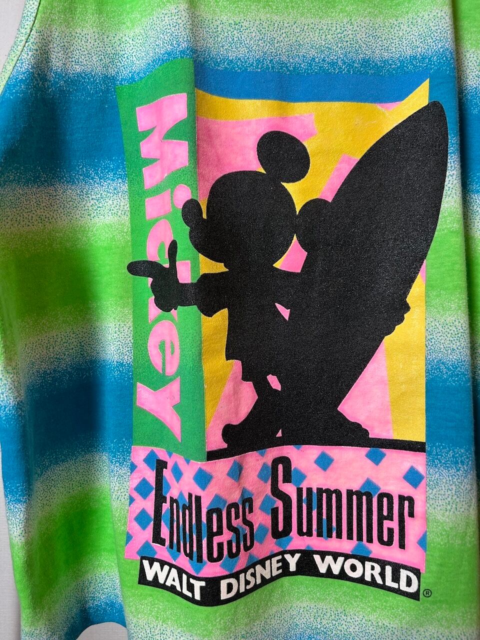 こちらの90's Mickey Surfer Tank Lは、1990年代アメリカ製のサーファーミッキータンクトップです。真夏のビーチ感溢れるカラーリングに加え、伝説のサーフィン映画を彷彿とさせるポップで可愛いプリントが施された一枚です。