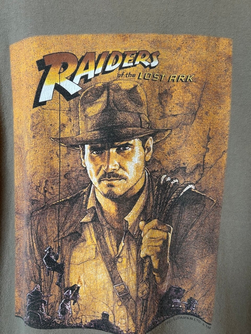 こちらの2001 Indiana Jones Tee Mは、名作映画「失われたアーク」のおそらくはDVD盤などの発売時のプロモTシャツと思われます。ディズニータグはおそらくどこかの業者が後付けした物で間違いなさそうな奇天烈な一着。若き日のハリソンフォード、かっこいいですね。