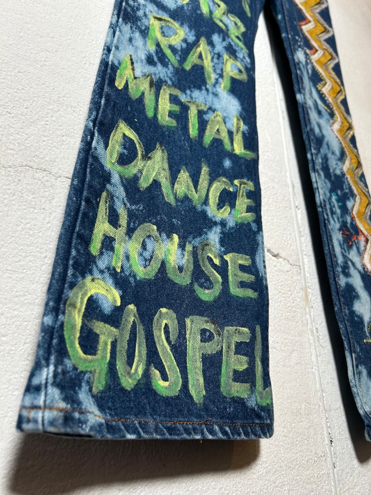 ユニークでレトロな魅力を持つ、UPRUPR upcycle jeans W36をぜひご覧ください。このジーンズは、80年代のLevi's 517ブーツカットをベースに、北米滞在中に施された特別な染めとペイント、そして日本で丁寧に行われたビンテージファブリックが手縫い刺繍で施された特別な一品です。どこか哀愁漂うこのジーンズは、あなたの日常スタイルに特別な個性を与えてくれることでしょう。